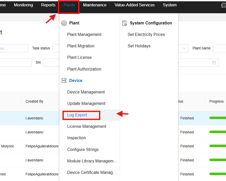 Sigue estos pasos para generar y descargar los registros desde la plataforma web de FusionSolar: