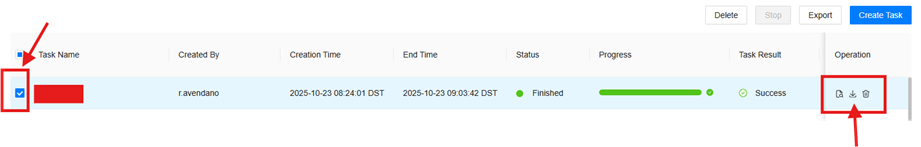 Cuando el estado indique que la tarea está completa, selecciona la fila correspondiente y haz clic en el ícono de descarga (una flecha hacia abajo sobre un documento).