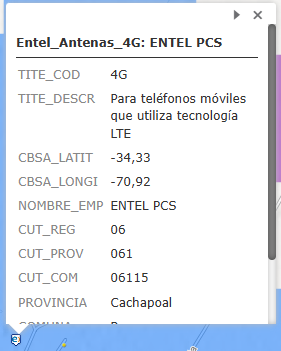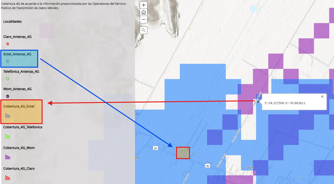 Como muestra la imagen, las coordenadas me indican que el mejor operador 4G en la zona es ENTEL y además, me indica hacia donde se encuentra mi antena repetidora mas cercana.