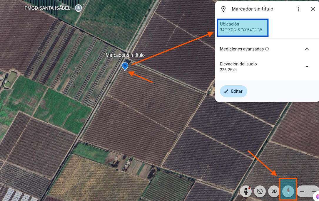 Primero, para determinar el AZIMUT, debemos entender que este se mide en grados de 0° a 360° en sentido de las agujas del reloj, casi siempre tomando como grado 0° el norte geográfico. Entonces, una forma simple de conocer la distancia entre mi proyecto y la antena, además de conocer los grados de azimut es usando google earth (https://earth.google.com/web/@-35.69371622,-71.31850867,467.97074819a,49002.44992465d,35y,-0h,0t,0r/data=CgRCAggBOgMKATBCAggBSg0I____________ARAA?authuser=0) donde primero pondré las coordenadas o dirección de mi proyecto y pondré un marcador de la siguiente manera.