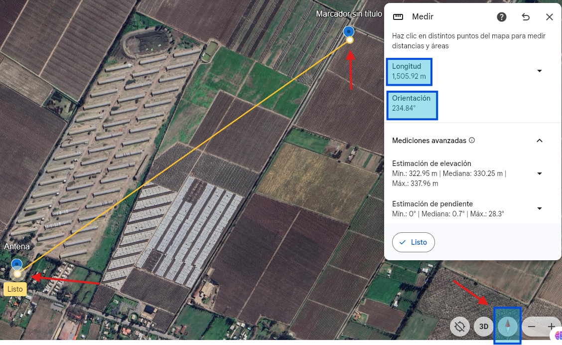 Ahora, en base a la información de coordenadas de la antena mas cercana, obtenida en la pagina del mapa de coberturas de la SUBTEL, pondré el segundo marcador de referencia en y mediré la distancia entre mi punto de referencia y la antena.