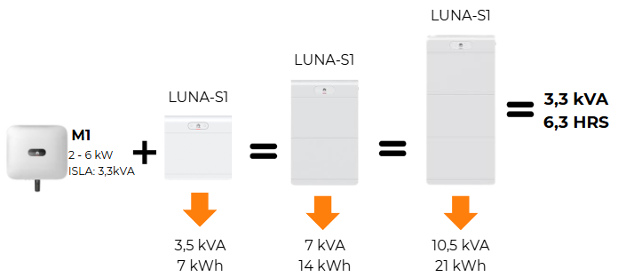 Para un inversor trifásico de la familia M1 de 6kW, junto con la batería LUNA-S1 en sus tres configuraciones, la limitación estaría presente en el inversor, ya que esta solo puede entregarme 3,3 kVA en modo Isla total.