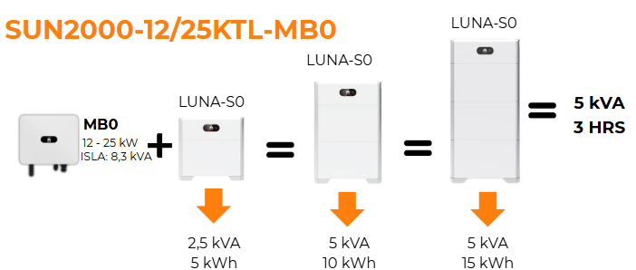 Para un inversor trifásico de la familia MB0 de 25kW, junto con la batería LUNA-S0 en sus tres configuraciones, la limitación estaría presente en la bateríar, ya que esta solo puede entregarme 5 Kva en modo Isla total.