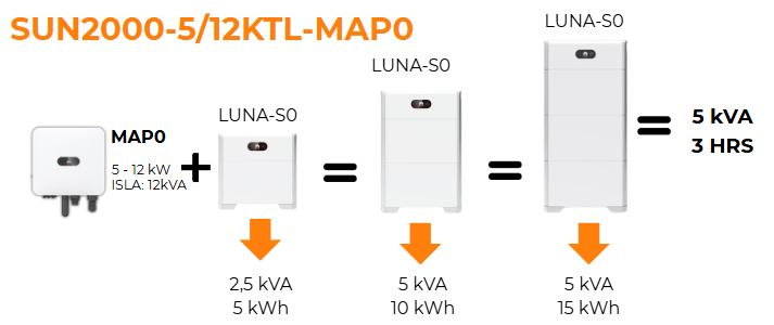 Para un inversor trifásico de la familia MAP0 de 12kW, junto con la batería LUNA-S0 en sus tres configuraciones, la limitación estaría presente en la bateríar, ya que esta solo puede entregarme 5 kVA en modo Isla total.