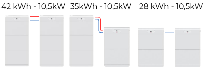 La mayoría de los inversores pueden tolerar 2 torres de baterías conectadas en serie, pudiendo tener con esta versión de batería hasta 42 kWh.